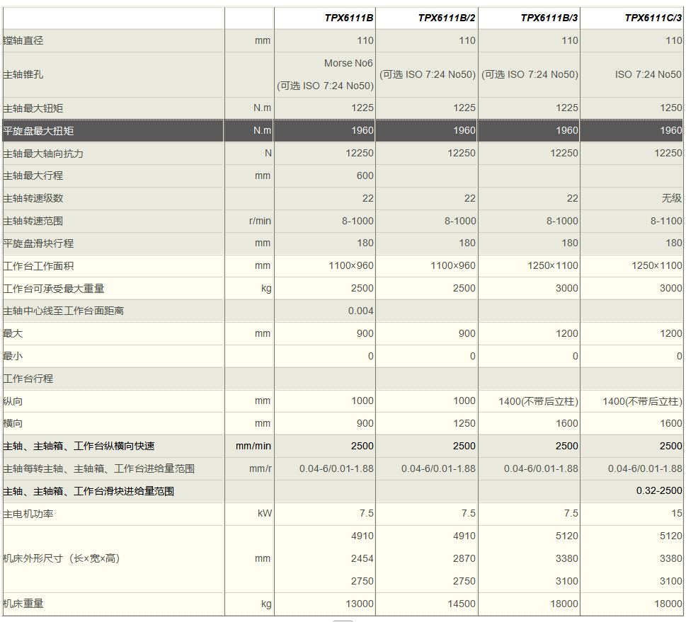 TPX6111B/3型卧式铣镗床,增加了工作台横向和主轴箱垂直行程,扩大了加工范围。工作台面积增大, 承载能力可达3000kg。 主轴可选用ISO7:24 No50锥孔, 可自动装卸刀。(后立柱为特供)